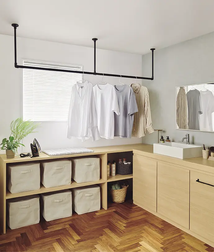 洗濯物を干すだけでなく、アイロンがけや衣類収納まで一か所で完結できる家事ラク空間です。