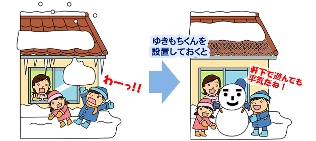 軒先から直近の雪止めまでの間に、ゆきもちくんを設置することにより、落雪による事故を未然に防ぐことができます。