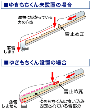 ネットの上に雪が降ることで、積もった雪がネットに嚙みこみ、これにより屋根面と積雪との間に大きな摩擦ができて、雪が屋根面から滑り落ちるのを防止する仕組みです。