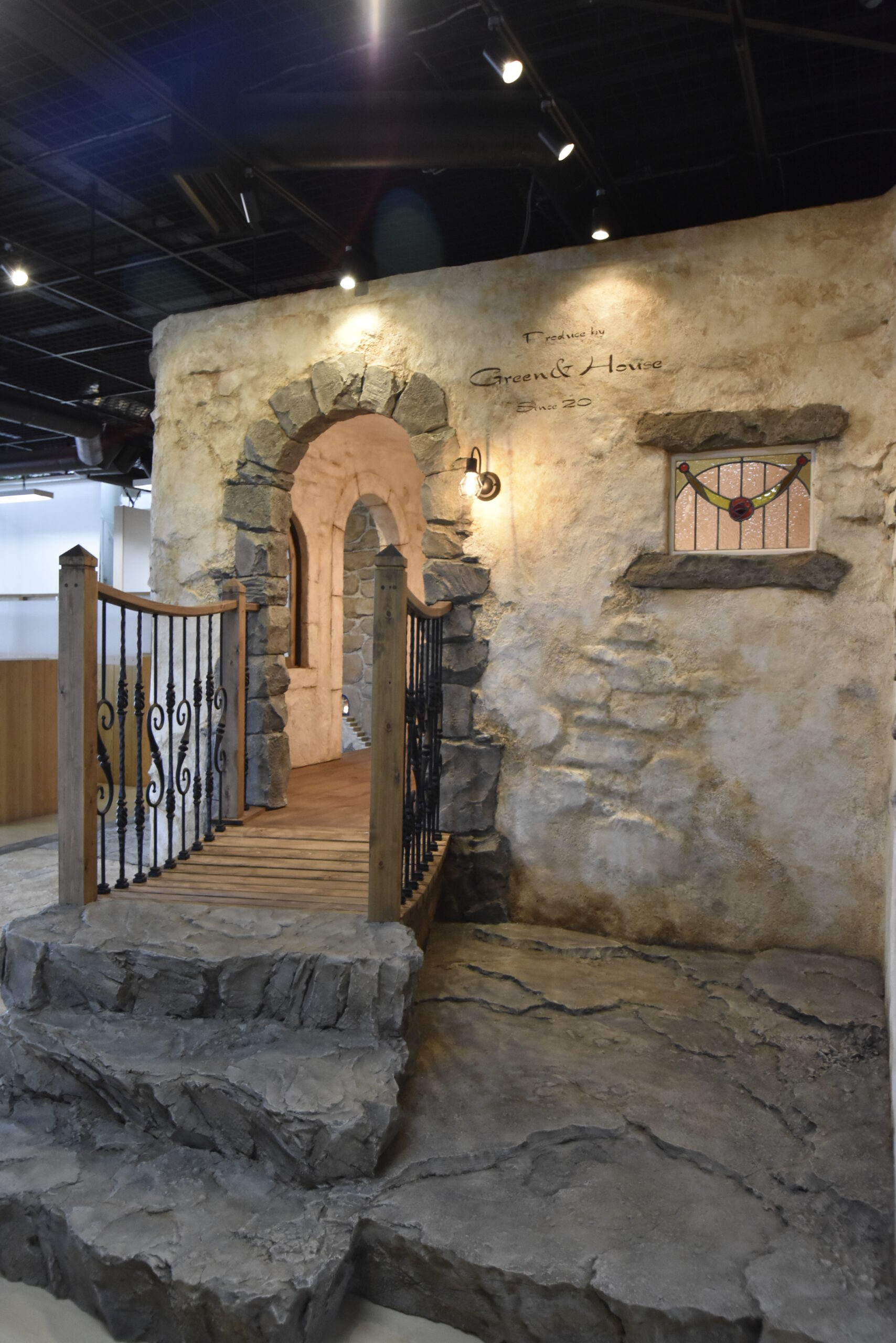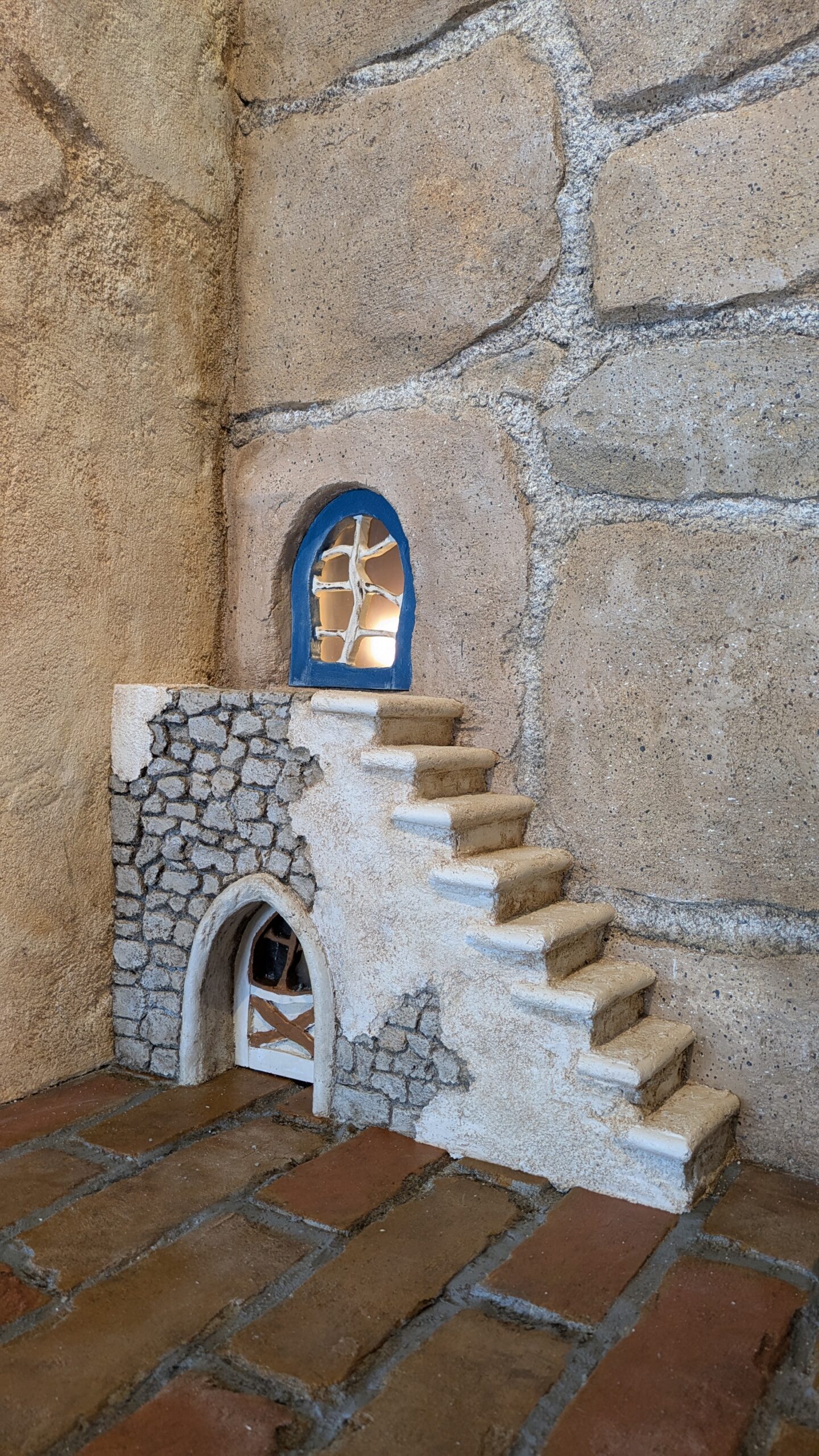 壁の石、地面のレンガもすべてモルタル造形で作っています。