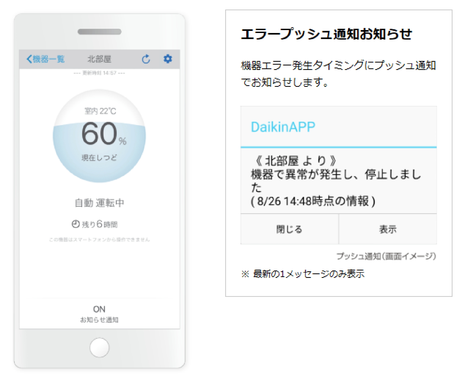 離れた場所からお部屋の除湿度、運転状態、タイマー残時間が確認可能です。