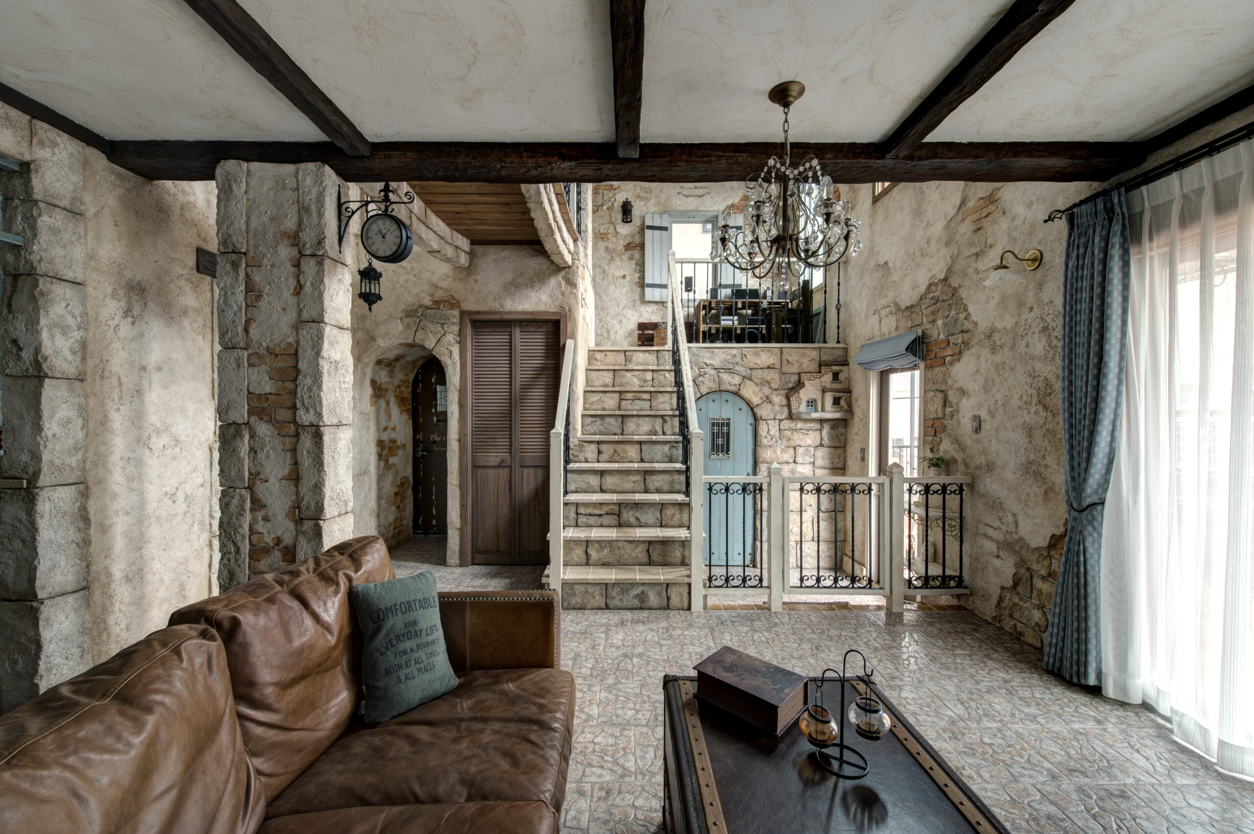 モルタル(セメントに砂と水を加えた建築材料)で、石積みや木材・レンガなどを壁などに彫刻したり、エイジング塗装することでアンティーク調を表現する技法のことです。