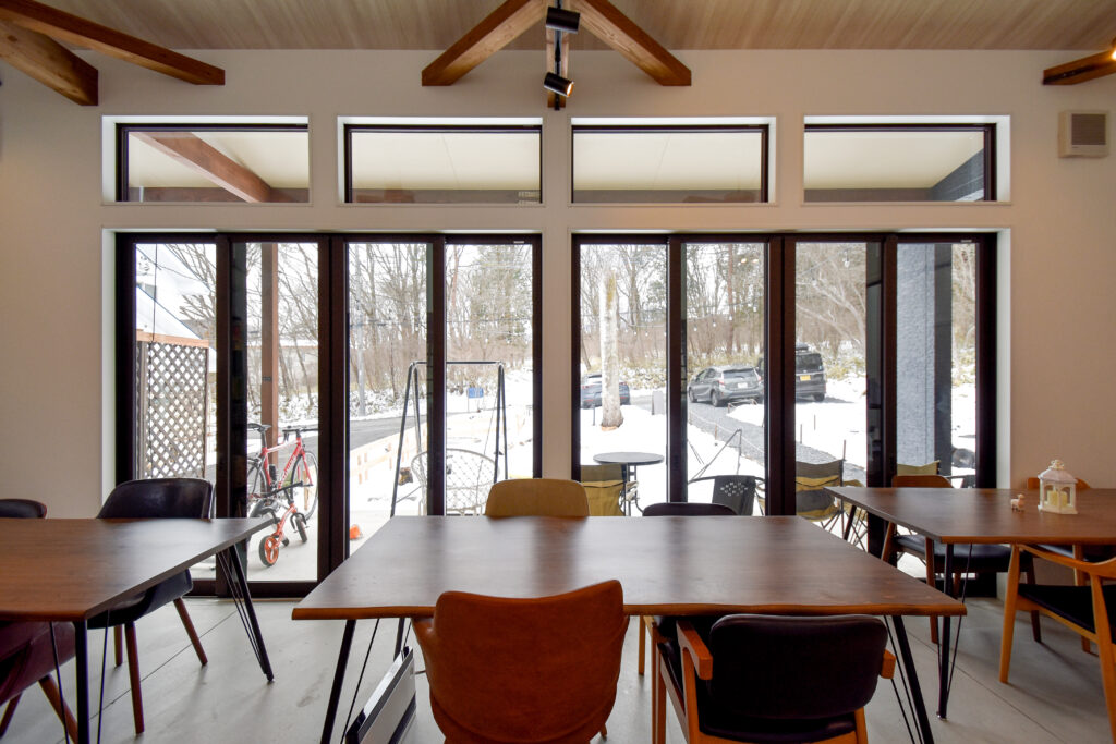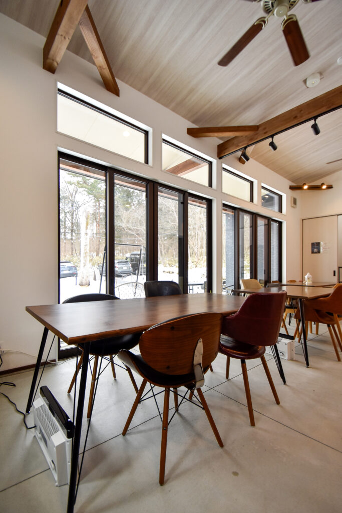 梁が目を惹く開放的な土間ホール(ダイニングスペース)